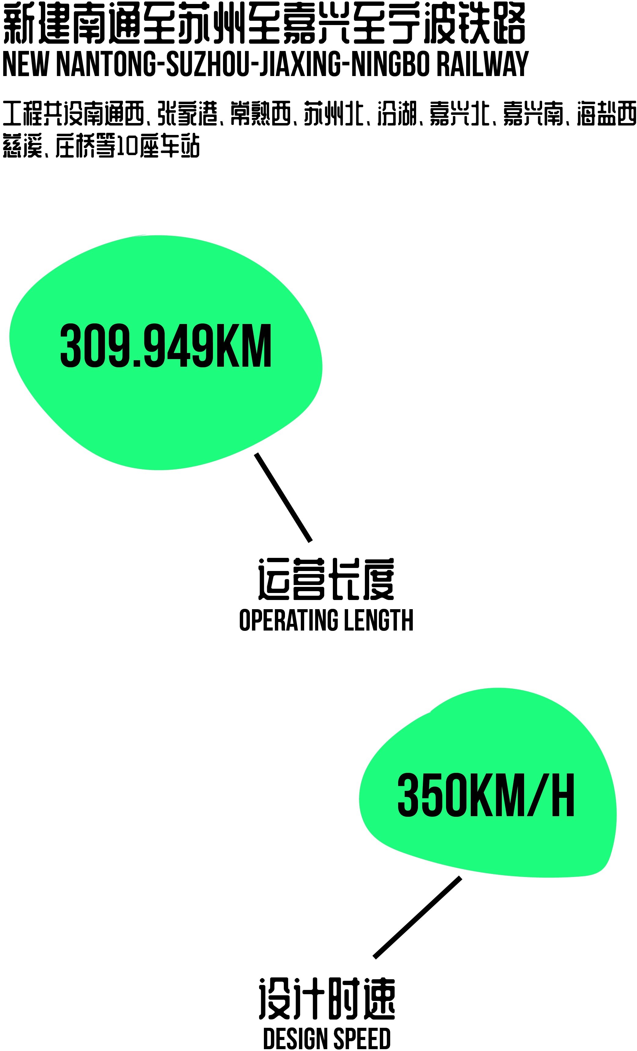 全线正线运营长度309.949km,其中新建线路长度300.876km(江苏省境内135.001km、浙江省境内165.875km),桥涵比约77%,隧道比约10%。工程共设南通西、张家港、常熟西、苏州北、苏州南(汾湖站)、嘉兴北、嘉兴南、海盐西、慈溪、庄桥等10座车站,设计时速350km/h。线路所经过的10座车站中,苏州占据了4座车站。其中,常熟西站、苏州南站(汾湖站)都是全新建造的高铁站。车站站房规模22000㎡,站房主体地上一层,局部二层,旅客进出站采用下进下出形式。