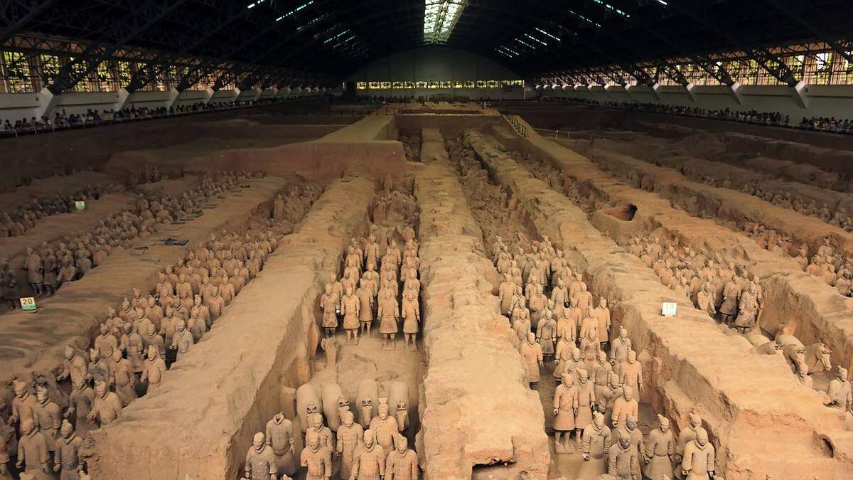 秦始皇陵是中国历史上第一个皇帝—秦始皇帝的陵园,也称骊山陵。兵马俑坑是秦始皇陵的陪葬坑,位于陵园东侧1500米处。其规模之大、陪葬坑之多、内涵之丰富,为历代帝王陵墓之冠。根据考古工作发现,秦陵的陵基为近覆斗方形,夯土筑成,陵基东西宽345米,南北长350米。围绕封土堆,在地面上还筑有两重南北向长方形城垣,内城和外城的四面均有城门,城的四角还筑有角楼。秦始皇陵是世界上规模最大、结构最奇特、内涵最丰富的帝王陵墓之一,实际上它是一座豪华的地下宫殿。
