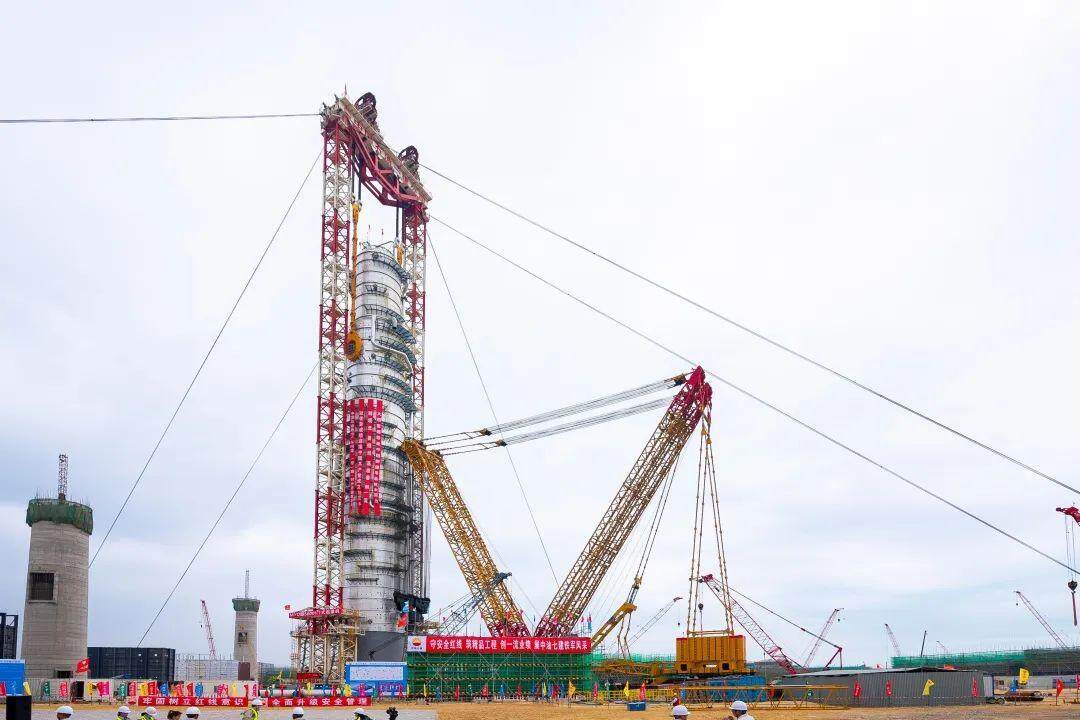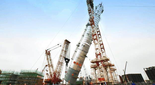 两台中国制造的堪称“世界之最”的重型吊装装备合力起吊“亚洲最大”抽余液塔并顺利安装就位,展现了中国装备设计、制造、吊装的综合实力。