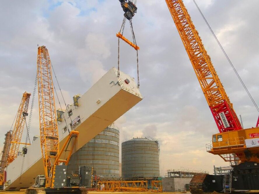 徐工机械起重机设计产品经理韩雷在采访中表示,“这样一个大型的反应器,在以往吊装的过程中,没有这样大型起重机之前需要分体吊装,需要大概几个月甚至一年的时间才能保证他的完成,而且需要很多的人员。那么现在吊装可以看到,只需要几个小时就可以把它一次吊装就位。”
