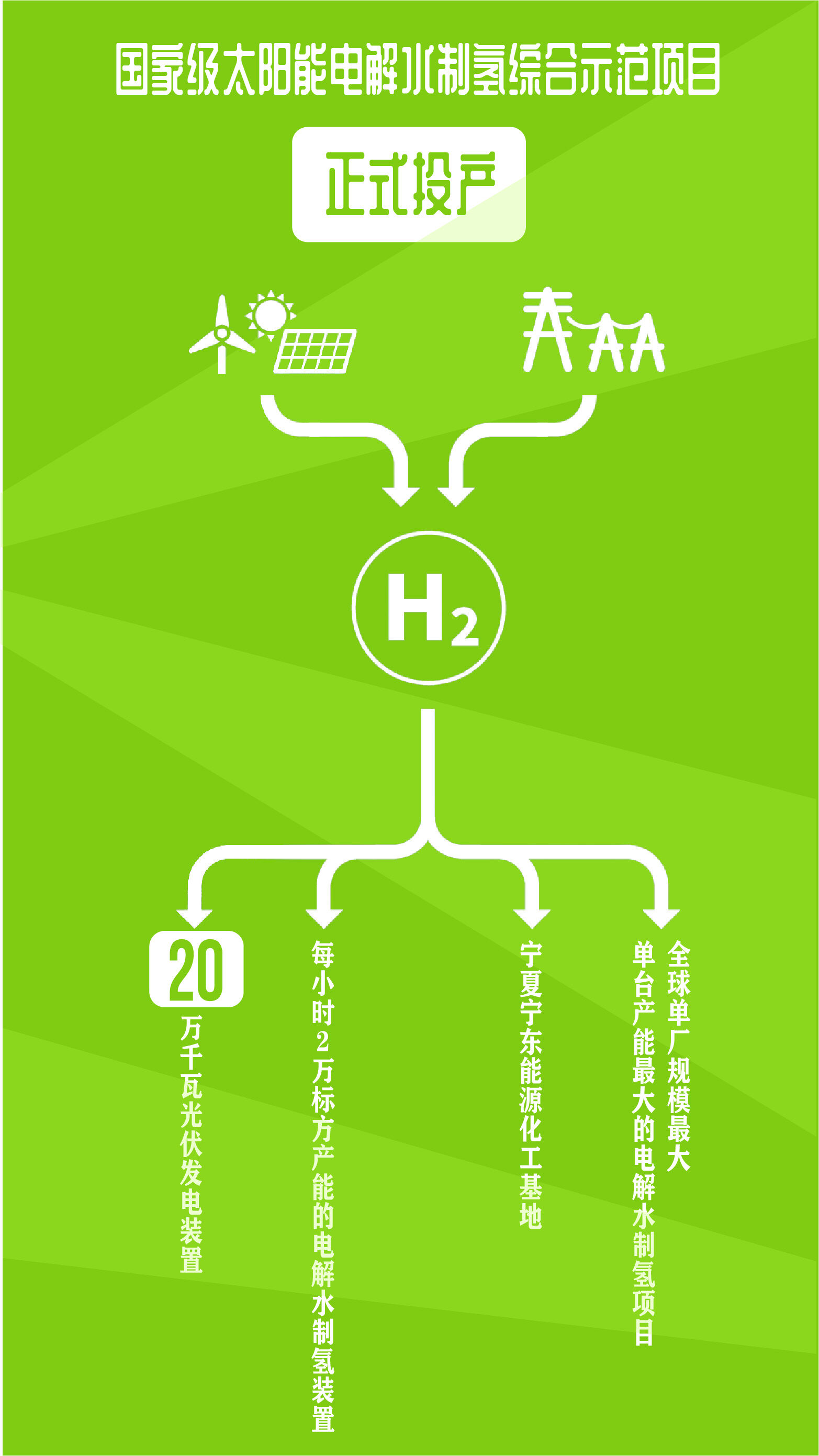 绿色氢气是当前新能源产业中的重点发展领域。近日,“国家级太阳能电解水制氢综合示范项目”在宁夏宁东能源化工基地正式投产。该项目包括20万千瓦光伏发电装置和产能为每小时2万标方的电解水制氢装置,为已知全球单厂规模最大、单台产能最大的电解水制氢项目。