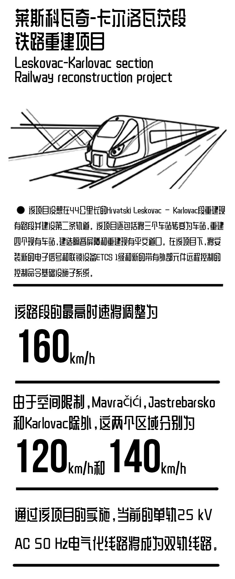 该路段的最高时速将调整为160km/h,但由于空间限制,Mavračići,Jastrebarsko和Karlovac除外,这两个区域分别为120km/h和140km/h。通过该项目的实施,当前的单轨25 kV AC 50 Hz电气化线路将成为双轨线路。