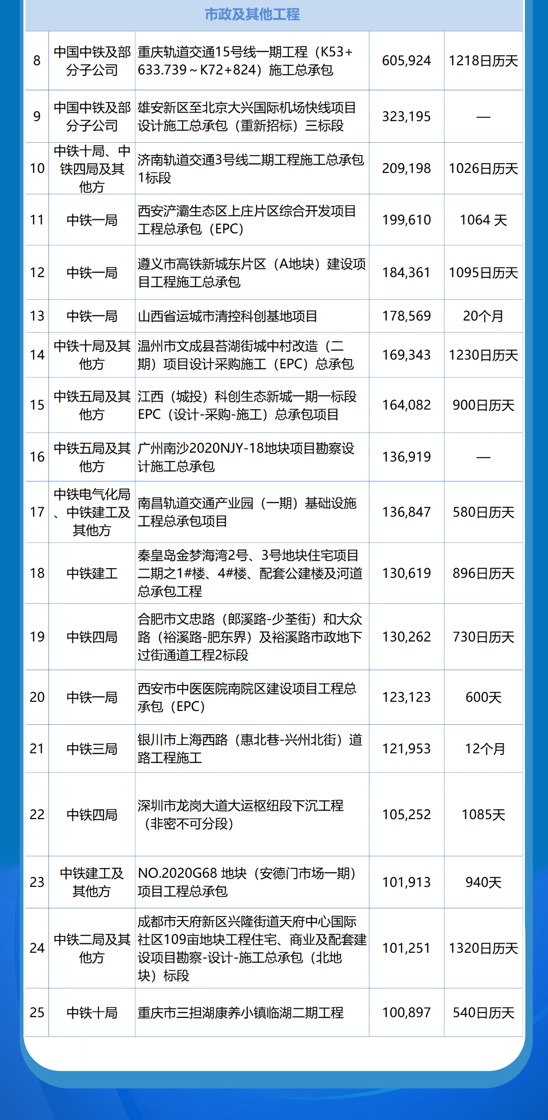 2021年4月21日,中国中铁发布公告,公司于近期中标多个重大工程,中标价合计约人民币5,484,798万元,约占本公司中国会计准则下2020年营业收入的5.65%。包括 5 项铁路工程、2 项公路工程以及 18 项市政及其他工程,其中市政及其他工程中标额占比约 59%,数量和金额双项领先。(转载请注明见道网 www.seetao.com )见道网工程栏目编辑/桑晓梅