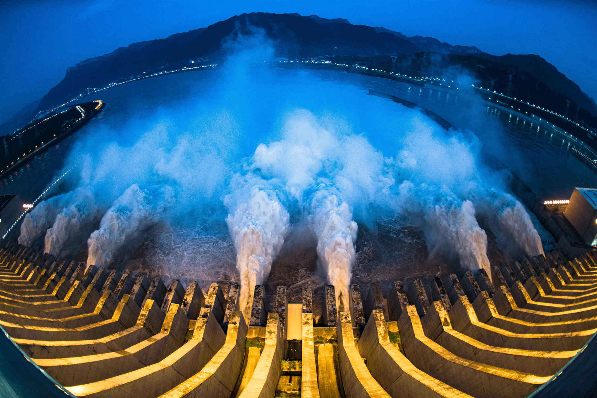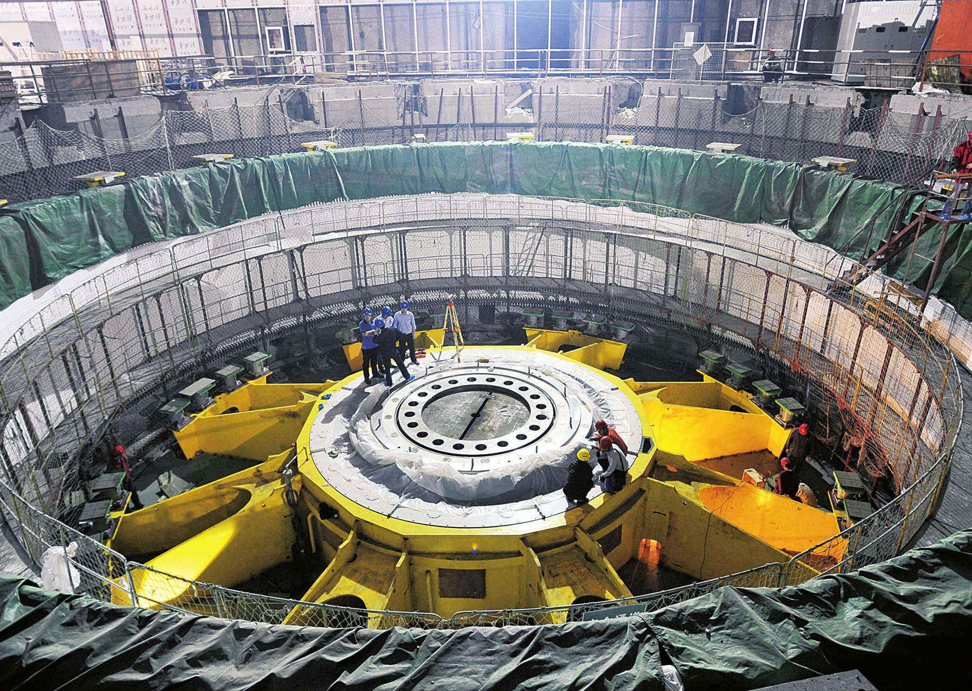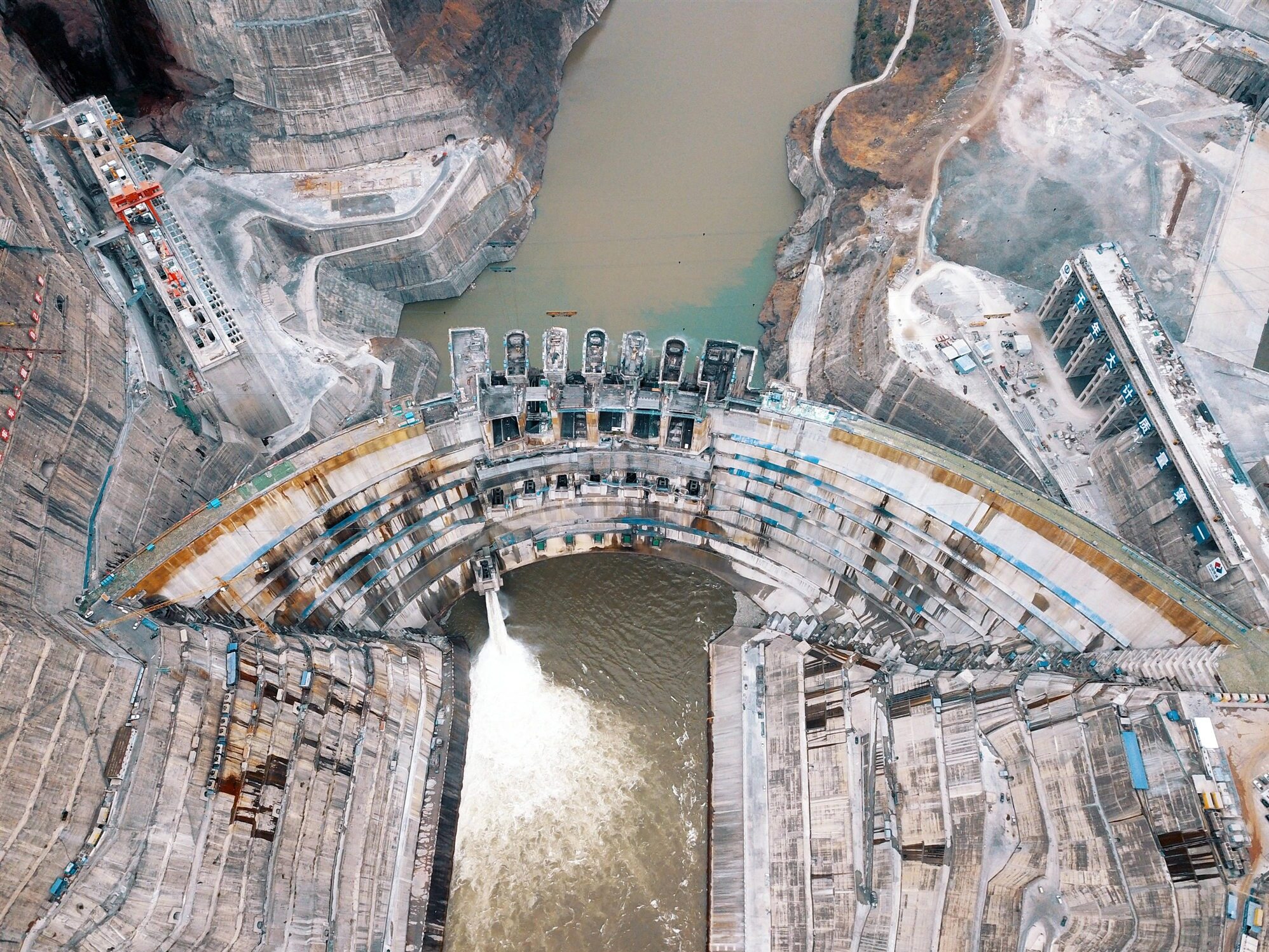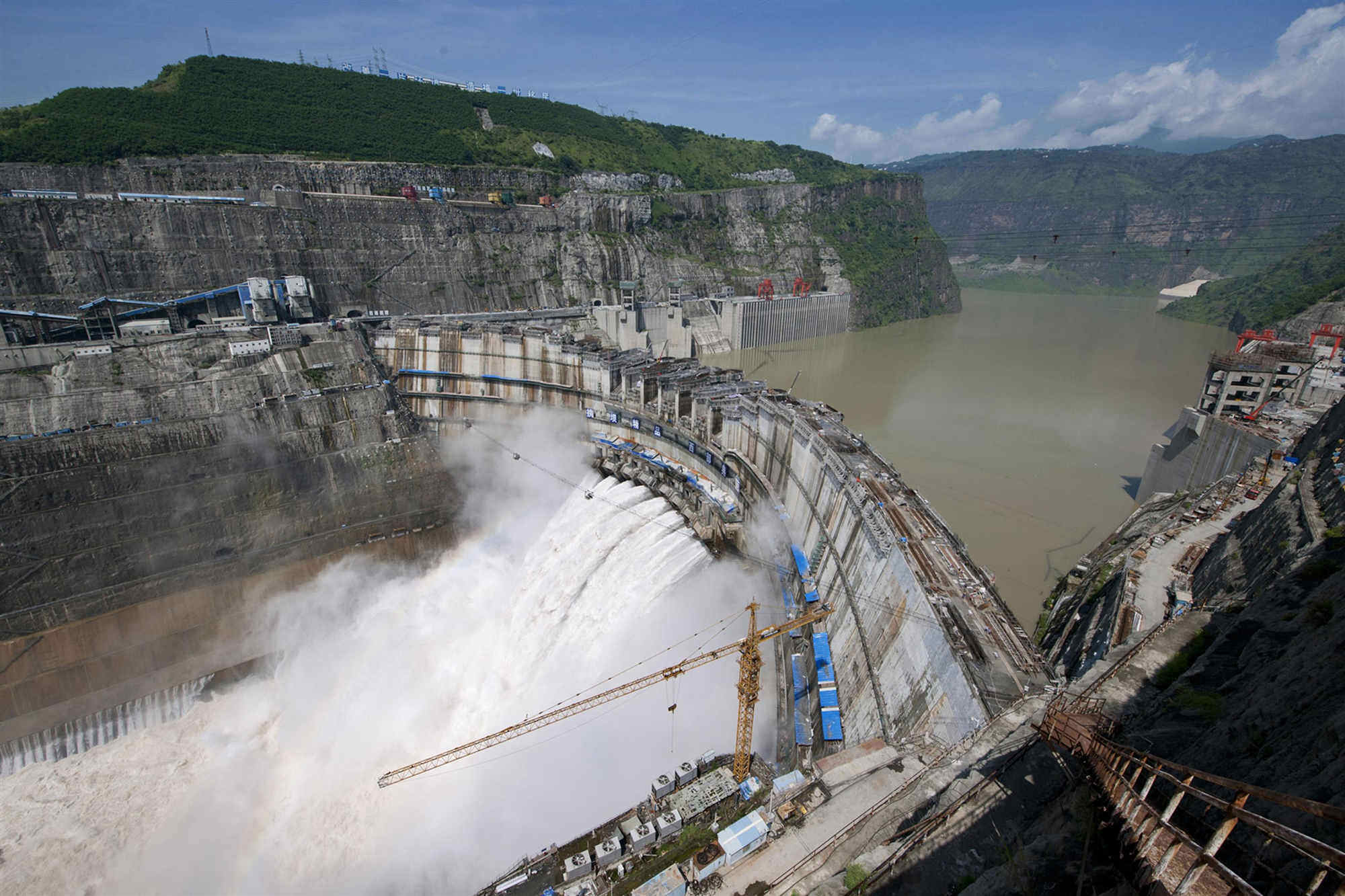 2021年4月6日20时,随着大坝导流底孔下闸,世界在建规模最大的白鹤滩水电站正式下闸蓄水,4月7日,白鹤滩水电站库区金沙江葫芦口段,低处的老大桥被淹没,白鹤滩水电站正式开始蓄水。白鹤滩水电站水库正常蓄水位825米,相应库容206亿立方米,地下厂房装有16台机组,初拟装机容量1600万千瓦,多年平均发电量602.4亿千瓦时。电站建成后,将仅次于三峡水电站的中国第二大水电站。
