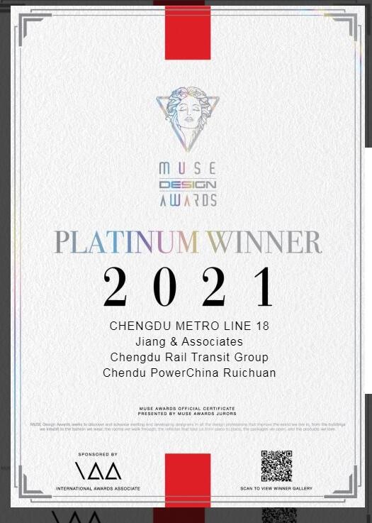 近日,美国MUSE Design Award 公布了2021全球获奖榜单,成都轨道交通18号线一二期工程车站公共区装修方案经过与全球102个国家和地区的42000份优秀参赛作品进行角逐,一举斩获室内设计类别最高荣誉铂金奖!