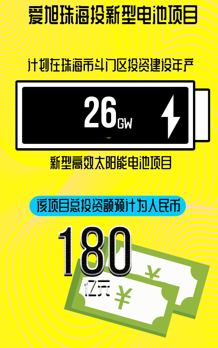 2021年4月23日,爱旭股份公告,公司拟与珠海市人民政府签订《关于爱旭太阳能电池项目的投资框架协议》,计划在珠海市斗门区投资建设年产26GW新型高效太阳能电池项目。该项目总投资额预计为180亿元。