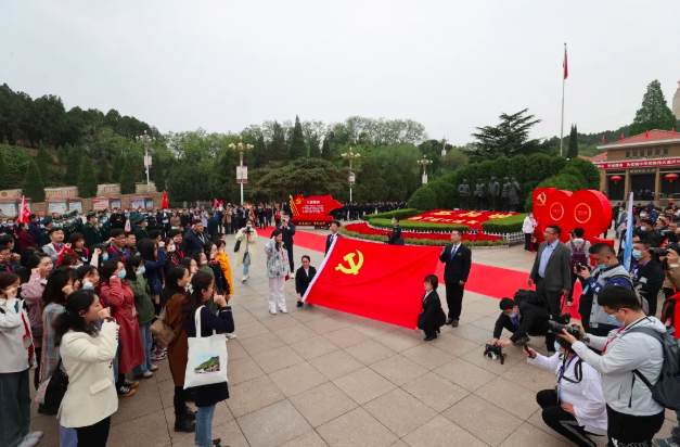 在“五大书记”塑像前,发现团集体缅怀革命先烈,以铿锵有力的声音重温入党誓词。