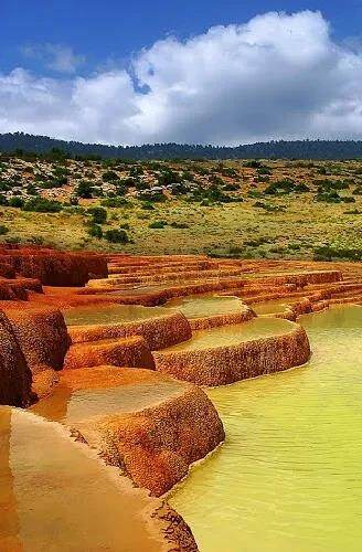Badab-e Surt是一系列梯形钙华(石灰石)池,比土耳其棉花堡的池要小,但在丹玛尔-莎丽公路以东23公里处的特尔玛·达雷转弯的山形山谷中,色彩斑and而宁静,被隔离在一个山岭环抱的山谷中。