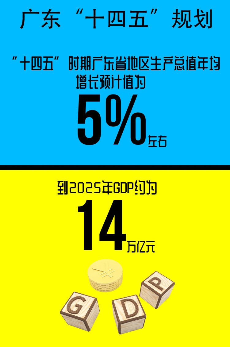 《纲要》中广东省“十四五”经济社会发展主要指标表显示,“十四五”时期广东省地区生产总值年均增长预计值为5%左右,到2025年GDP约为14万亿元。《规划纲要》提出,“十四五”时期经济社会发展努力实现经济发展迈上新台阶,创新强省建设取得新突破,现代产业竞争力赢得新优势,改革开放再出发迈上新高度,发展平衡性协调性实现新跨越,生态文明建设迈入新境界,文化强省建设迈出新步伐,幸福广东建设取得新成效,现代化治理能力达到新水平,统筹发展和安全实现新提升。