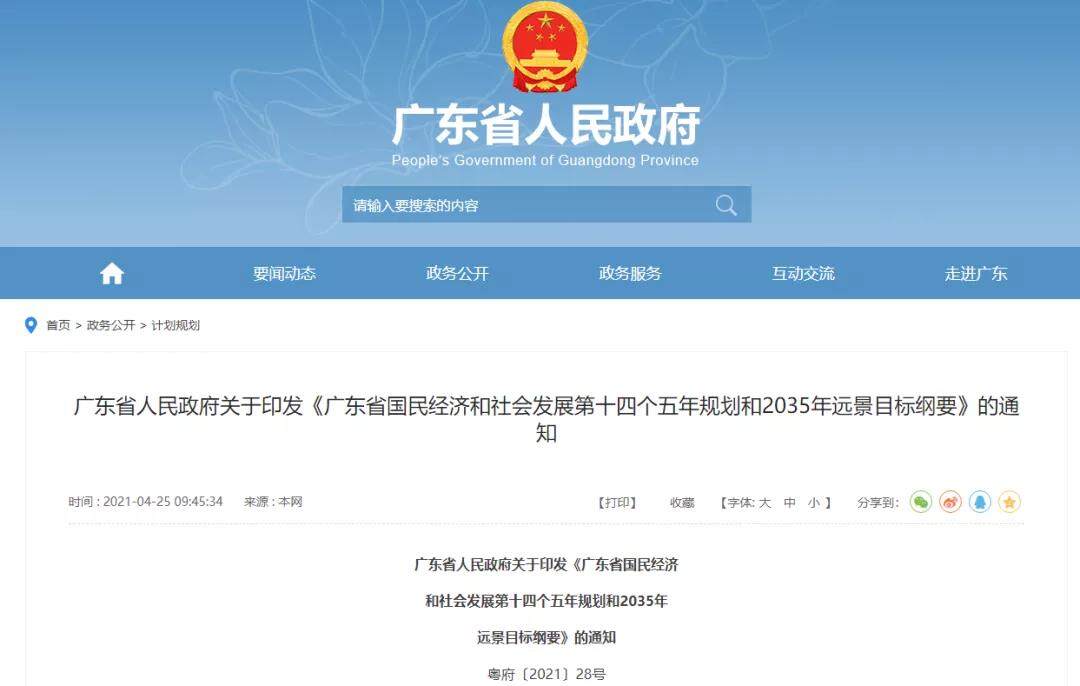 2021年4月25日,广东省人民政府正式印发了《广东省国民经济和社会发展第十四个五年规划和2035年远景目标纲要》。《纲要》全文共二十一章11万余字,为十四五时期广东经济社会发展谋划重大战略,部署重大任务,明确了未来五年广东省经济社会发展的宏伟蓝图和全省人民共同的行动纲领。