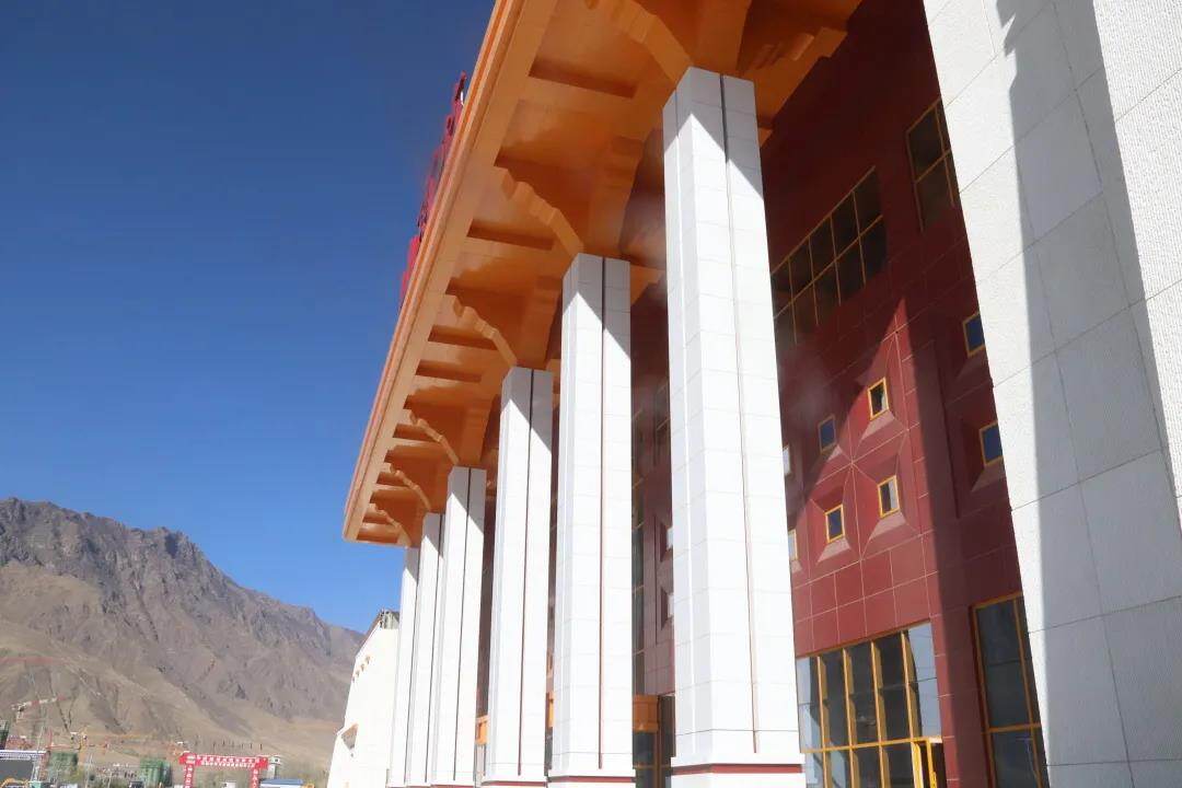 立柱内嵌藏红色线条,柱脚增加石刻吉祥结文化图案,中部幕墙的小窗洞取自藏式传统建筑的窗花,完美诠释“藏之源、山之南、河之畔、湖之蓝”的山南印象。