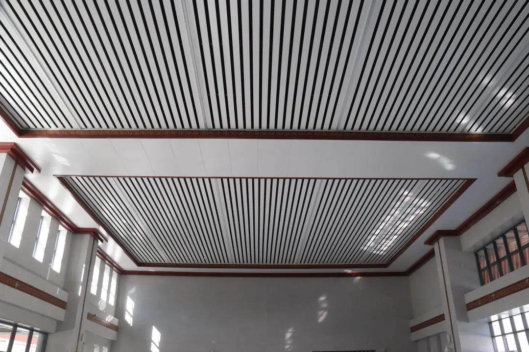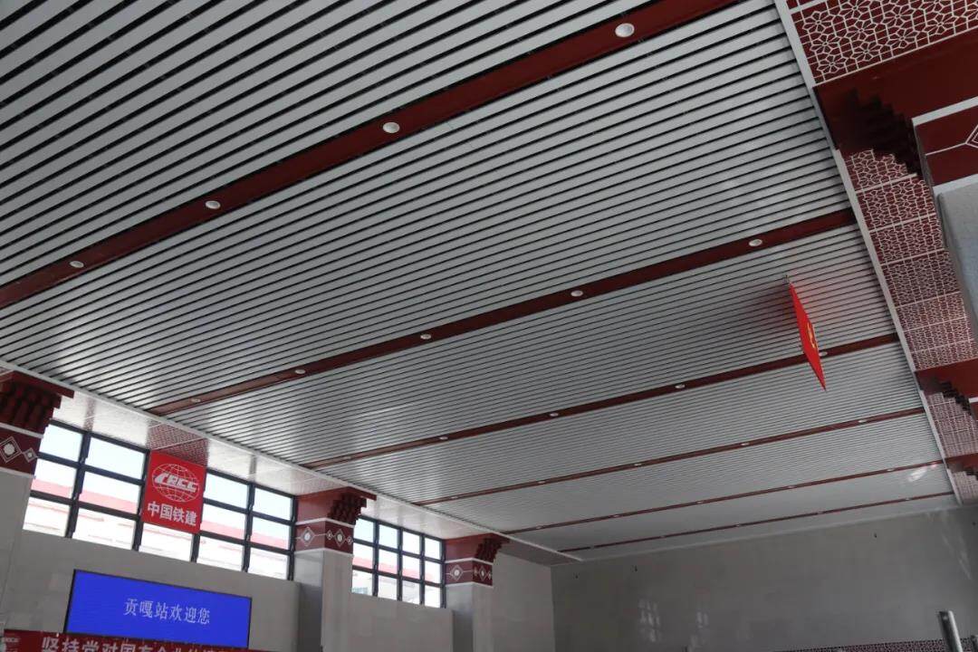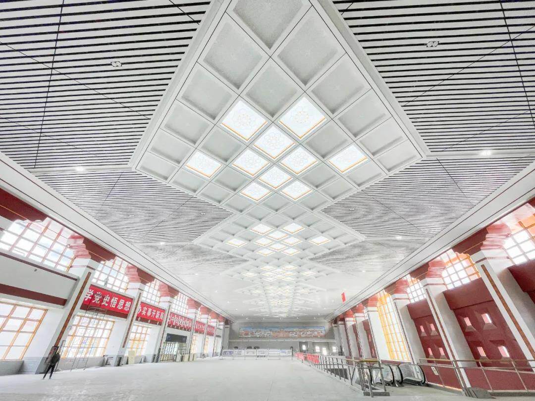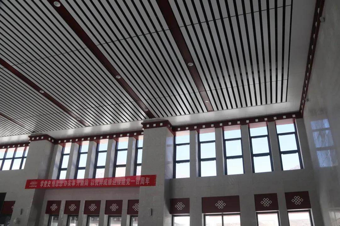 候车厅天花采用铝单板分隔处理,柱身和吊顶单板内侧竖向收边,增加内嵌藏式回形刻纹,向深厚的藏源文化表达敬意。