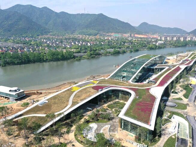 设计取意于《富春山居图》中的山水形态,在空间形体上勾勒出山峦起伏,与富春山隔江呼应;同时,灵动飘逸的曲线体现着水的柔美。山的坚毅和水的柔美,映衬着水上运动的魅力,在山水特质中展现水上运动中心的大气、灵动与开放。场馆与周围建筑、景观完美结合,顶部通过覆土的形式,打造与自然景观融为一体的“空中花园”,为市民游客提供一览富阳山水的好去处,充分发扬场馆的公共性和城市性。