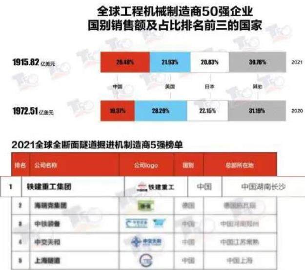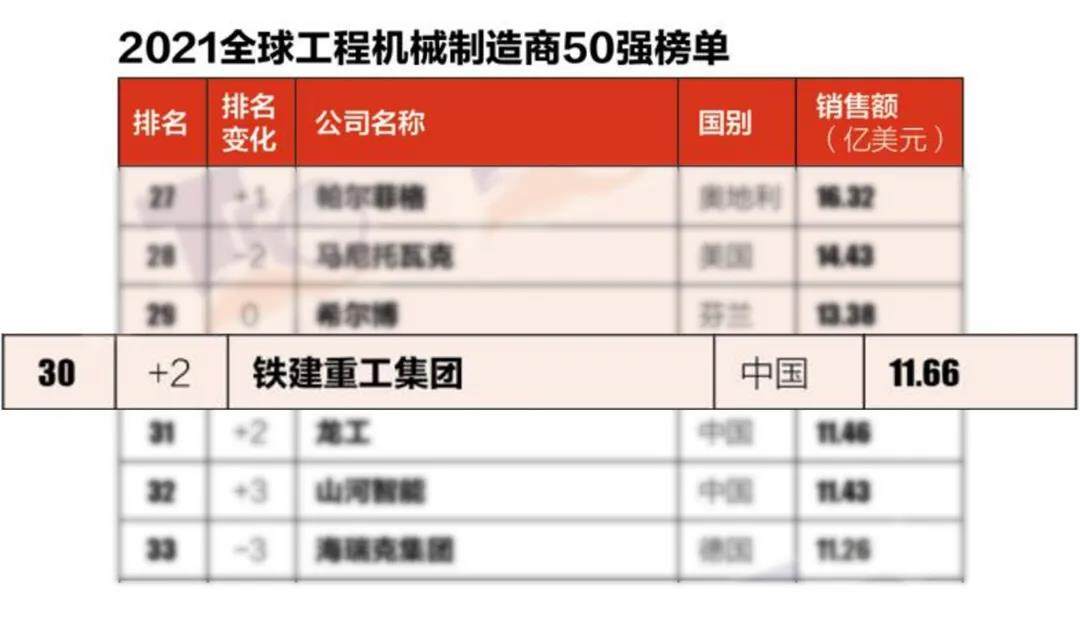 4月28日,2021年全球工程机械制造商50强榜单在北京发布,11家中国企业上榜,铁建重工首度跻身全球30强,位列榜单第30位,在上榜的中国工程机械制造商中位列第5。