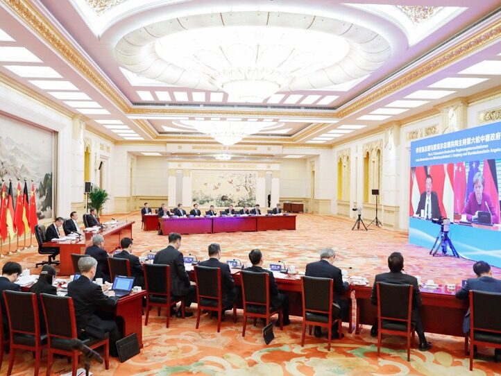 2021年4月28日,国务院总理李克强在北京人民大会堂以视频形式与德国总理默克尔共同主持第六轮中德政府磋商。两国总理听取了双方外交、经贸、司法、财政、工业、交通、教育、科技、卫生、农业、环保、社会保障等25个部门负责人的工作汇报。