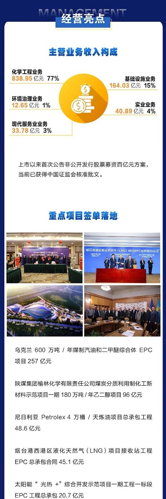 2020年年报显示,中国化学的主营业务为化学工程、基础设施、其他行业、现代服务业、环境治理,占营收比例分别为:76.27%、14.91%、3.72%、3.07%、1.15%。(转载请注明见道网 www.seetao.com )见道网工程栏目编辑/桑晓梅