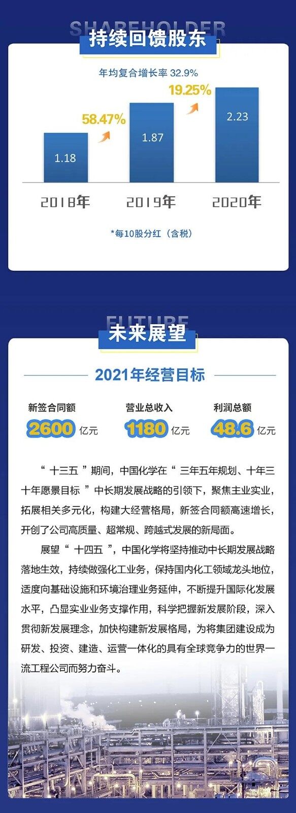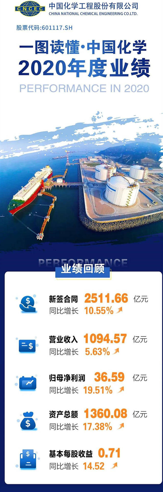 中国化学2021年4月29日发布年度业绩报告称,2020年归属于上市公司股东的净利润约为36.59亿元,同比增长19.51%;营业收入约为1094.57亿元,同比增长5.63%;基本每股收益盈利0.71元,同比增长14.52%。