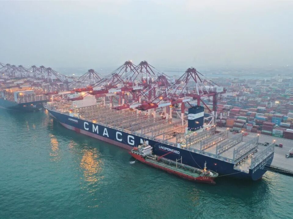 2021年4月27日“达飞伊瓜苏”轮首航靠泊山东港口青岛港QQCT码头,这是山东港口青岛港迎来的首艘 LNG(液化天然气)动力的集装箱船舶,该轮全长366米,最大载箱量14806TEU,相较于传统燃料船舶,LNG动力船舶可以降低99%的二氧化硫和细颗粒物排放量,降低85%氮氧化物排放量和20%的二氧化碳排放量。