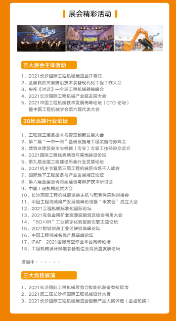 据了解,2021长沙国际工程机械展是2021年全球最大的国际工程机械展,将于5月19日-22日在长沙国际会展中心召开,包括展览展示、峰会论坛、商务活动、竞技展演4大部分,展会总面积达到30万平方米,参展企业1450家。全球工程机械50强企业中,参展参会的将有卡特彼勒、三一集团、日立建机、利勃海尔、特雷克斯、中联重科等32家。从展会展览面积和50强企业参展数量来看,2021长沙国际工程机械展已比肩德国宝马展、法国巴黎展、美国拉斯维加斯展世界三大工程机械展。历经730多天的紧张筹备,一场30万m*的今年全球最大的全球工程机械展览会目前各项工作已经就绪。据组委会介绍,从今日开始,卡特彼勒、三一集团、日立建机、利勃海尔、柳工集团等全球工程机械50强企业都将陆续进场布展。张飚现场预告:“海外参展企业日立建机,将会于5月13号左右携120吨超大型挖掘机进场布展,2021长沙国际工程机械展览会首个进场布展的海外展商。”