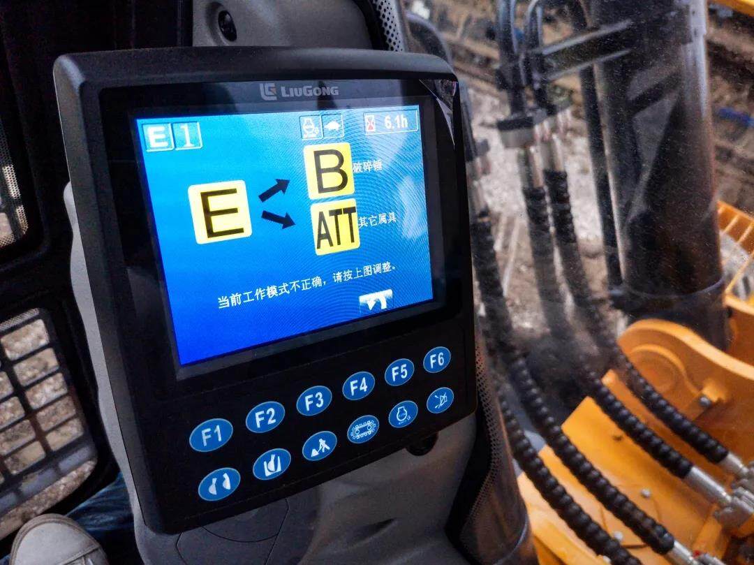 破碎作业工况检测,智能屏幕提醒;仪表一键切换单(B)、双泵(ATT)合流模式。
