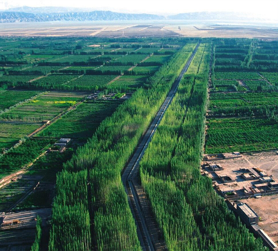 柯柯牙绿化工程实施以来,昔日的戈壁荒滩上已建成,南北长25公里,东西宽约2公里的“绿色长城”,造林面积120余万亩,昔日的风沙策源地,变成了阻挡沙漠前进的绿色屏障,当地沙尘天气减少了61%。
