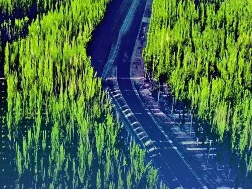 全长1900余公里的吐和高速公路,经过阿克苏市时与荒漠戈壁中的柯柯牙相遇了。柯柯牙,书写了新疆版的塞罕坝荒漠绿化奇迹,人们想不到这里以前是光秃秃的布满盐碱的风沙策源地。