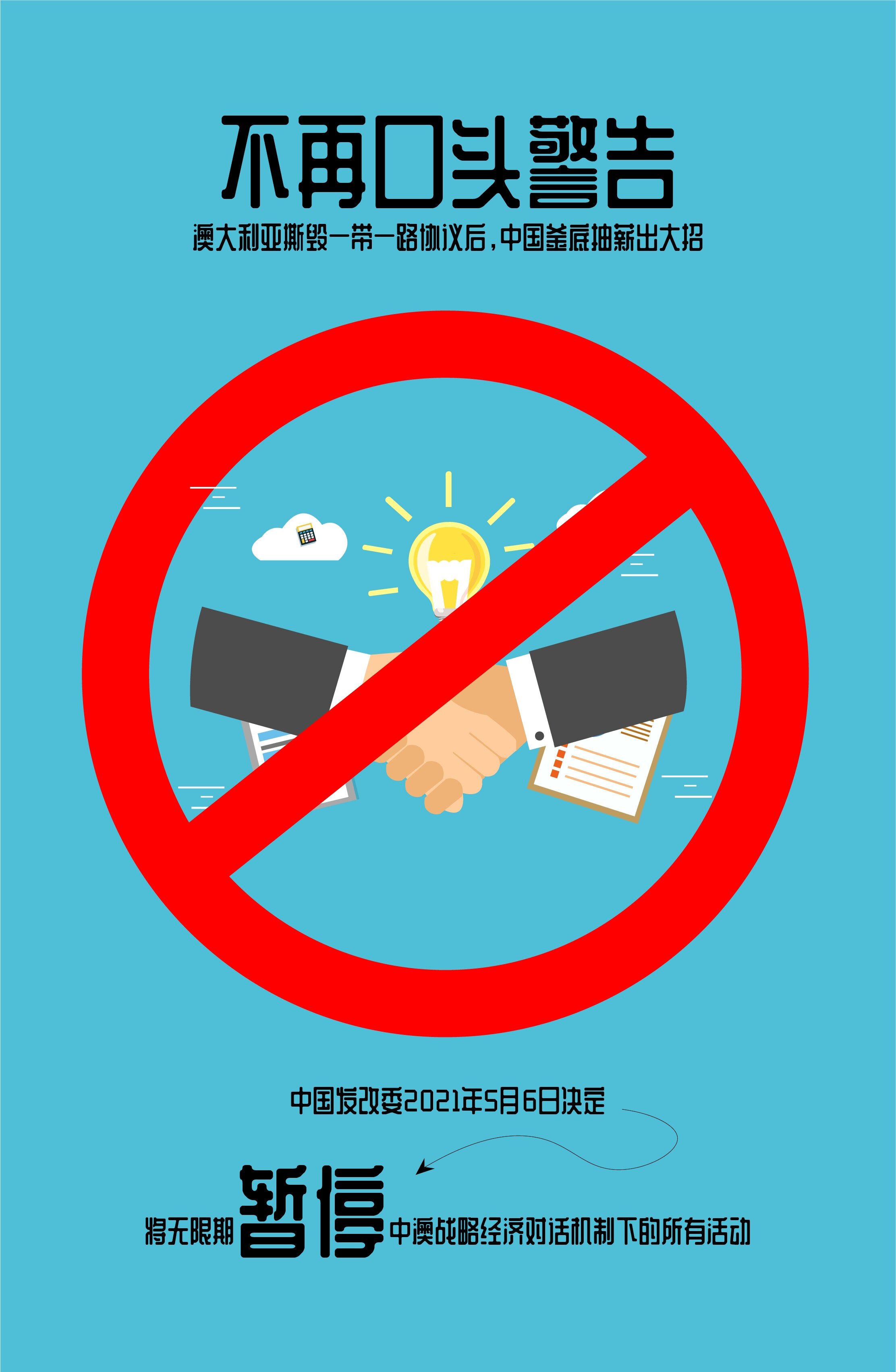 由于澳方政府的一些人士近日破坏两国合作尤为“变本加厉”,中方于2021年5月6日正式发布了声明。中国发改委决定,即日将无限期暂停中澳战略经济对话机制下的所有活动。(转载请注明见道网 www.seetao.com )见道网一带一路栏目编辑/田增鹏、设计/夏长旺
