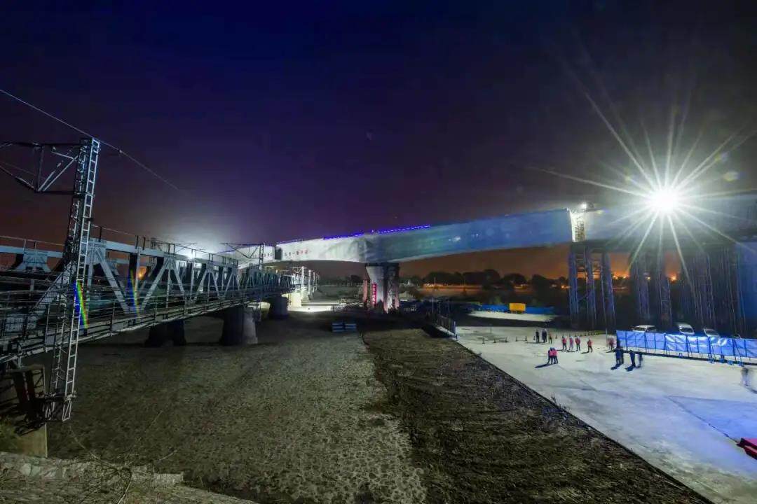2021年5月8日0时50分,两座万吨T型桥墩同时开始逆时针转动,约49分钟之后,大桥转动33度,在京广铁路上方精准合龙。
