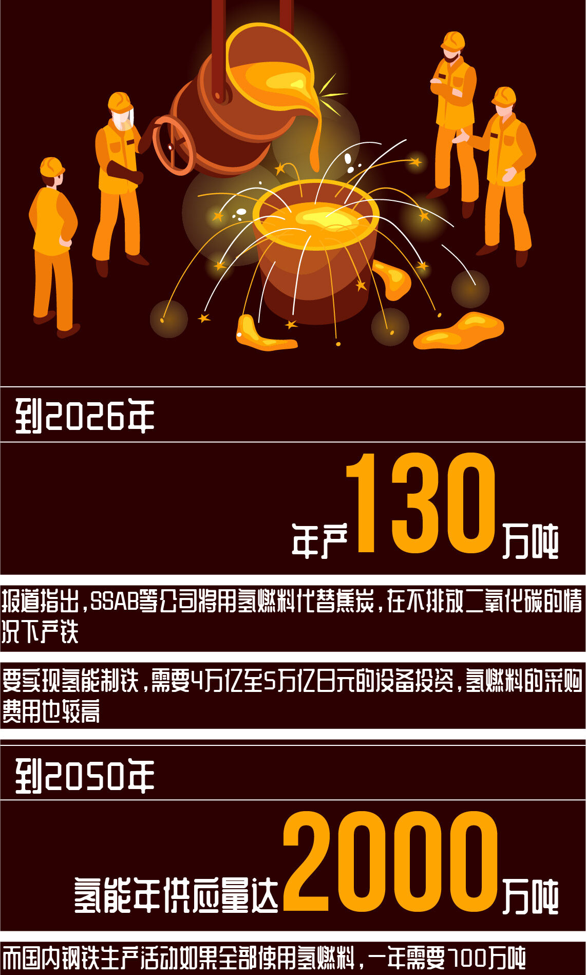 报道称,到2026年,这家钢铁厂将年产130万吨铁,相当于一座小型高炉的产量。报道指出,SSAB等公司将用氢燃料代替焦炭,在不排放二氧化碳的情况下产铁。2020年8月31日,试验工厂已在位于瑞典北部的吕勒奥启动。出席启动仪式的瑞典首相斯特凡·勒文说:“今天将为20年后瑞典钢铁行业彻底远离化石燃料和二氧化碳奠定基础。”