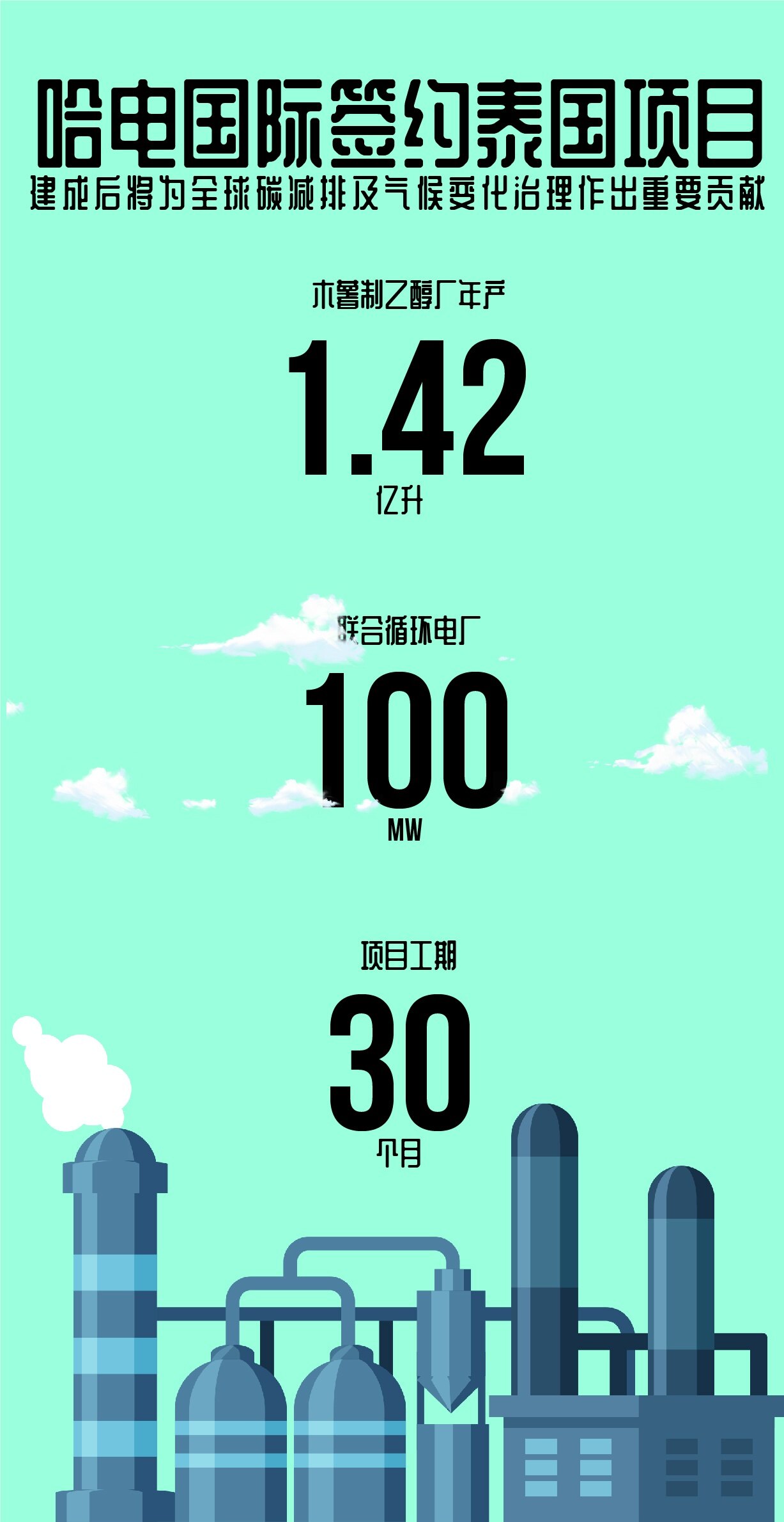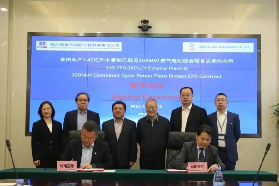 2021年5月17日,哈电国际与泰国Capital One Enterprises Co., Ltd (COE)在哈尔滨成功签订“泰国年产1.42亿升木薯制乙醇及100MW联合循环电站综合项目”EPC总承包合同。该项目的成功签约,标志着哈电国际拓展工程总承包领域跨行业发展取得了进一步突破。泰国综合项目的建设,是哈电国际响应碳达峰、碳中和战略要求,为全球碳减排及气候变化治理贡献力量的具体实践。