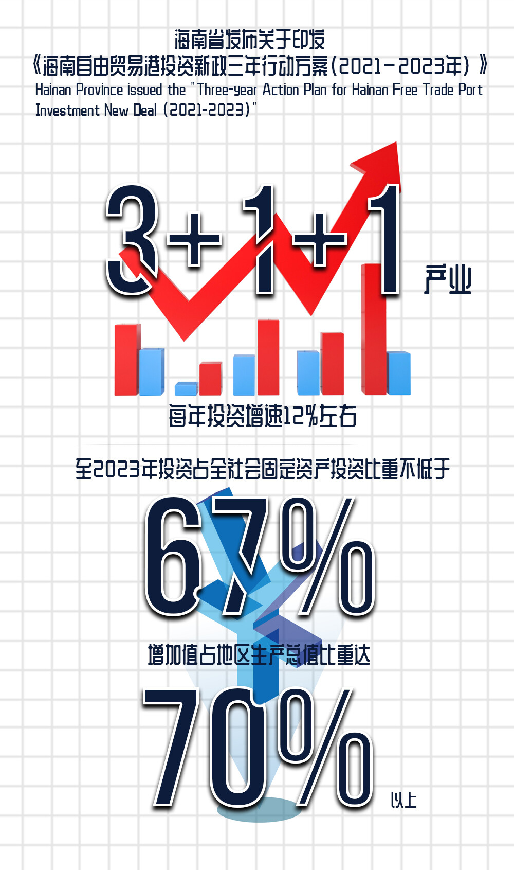 投资作为拉动经济增长的三驾马车之一在海南自贸港建设中的地位不言而喻。5月17日,海南省发布关于印发《海南自由贸易港投资新政三年行动方案(2021-2023年)》(以下简称方案)的通知,明确了2021年至2023年三年投资新政策,提出把制造业提质增效、稳定发展放到更加重要的位置。方案明确,期间“3+1+1”产业每年投资增速12%左右,至2023年投资占全社会固定资产投资比重不低于67%,增加值占地区生产总值比重达70%以上。