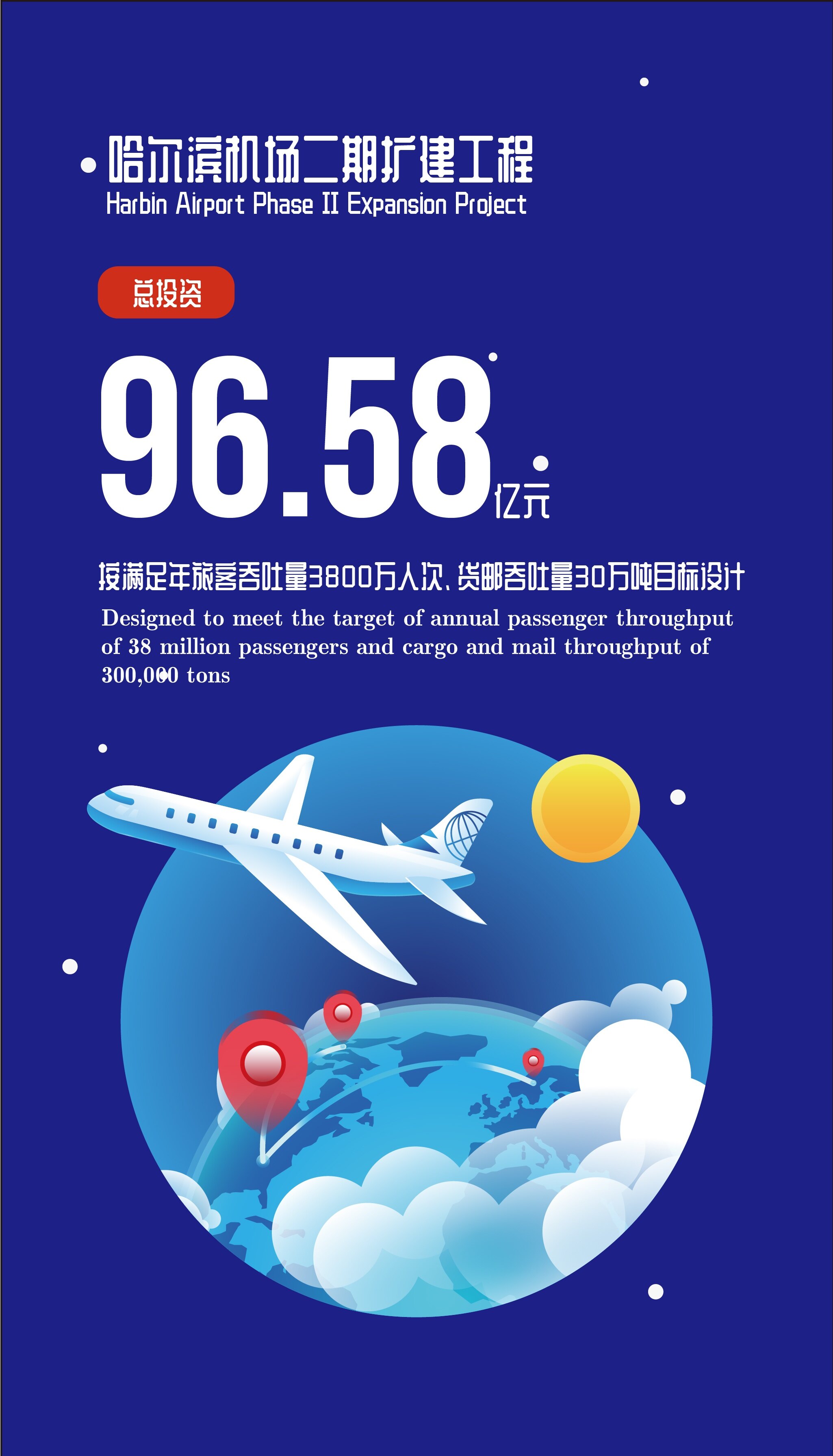 哈尔滨机场二期扩建工程按满足年旅客吞吐量3800万人次、货邮吞吐量30万吨目标设计,主要建设内容包括机场工程、空管工程、供油工程、汽车加油站工程等。项目总投资约96.58亿元,其中机场工程91.92亿元,具体建设项目为在现有跑道东侧760米处新建1条长3600米、宽45米的东二跑道及相应的滑行道系统,飞行区等级指标为4E;新建90个机位的站坪、2万平方米的货运站,配套建设助航灯光、消防救援、供电、供水等设施。