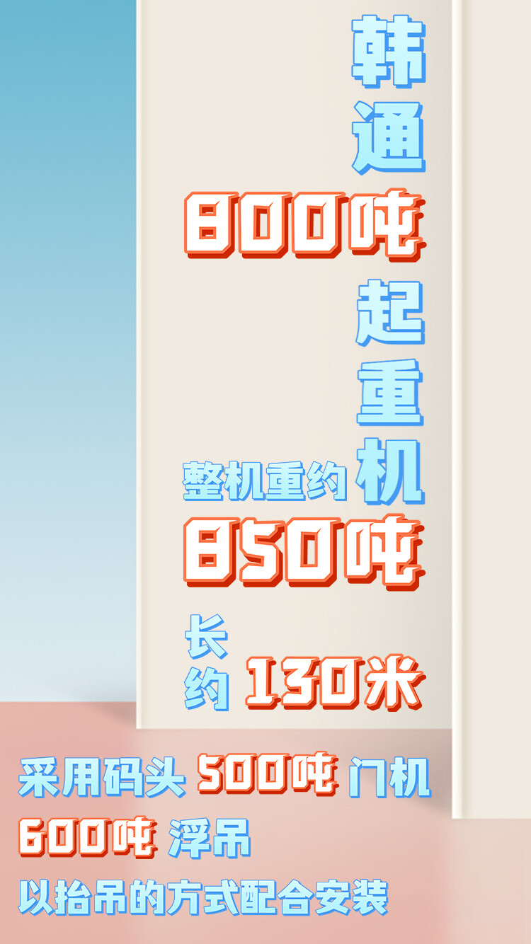 韩通800吨起重机整机重约850吨,长约130米,采用码头500吨门机和1600吨浮吊以抬吊的方式配合安装。该项目总装调试周期短,为了保证产品按时交付,在策划安装方案时,项目部决定在船体到达码头后,采用整机模块一体吊装方式。