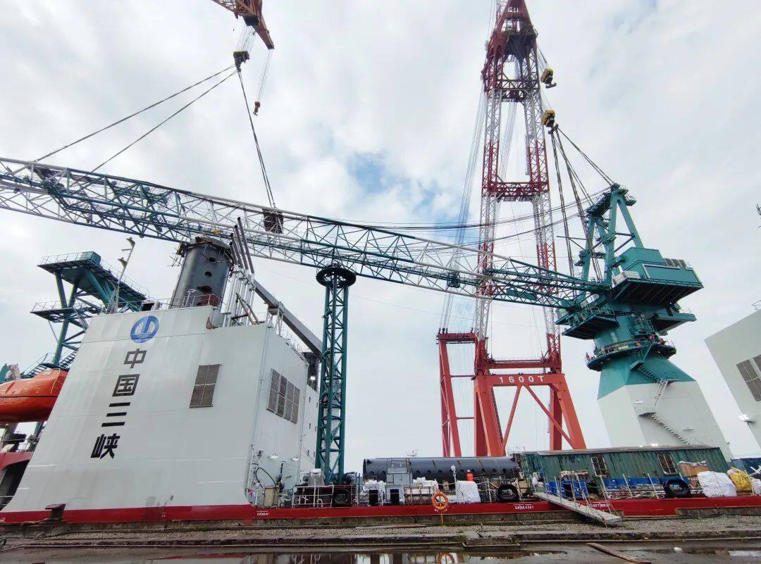 整机模块一体吊装,就是在岸上先将转盘、人字架、臂架等结构组装成一个模块,并完成各机构钢丝绳缠绕和部分机构的调试工作,最后再将整个模块一体吊装。