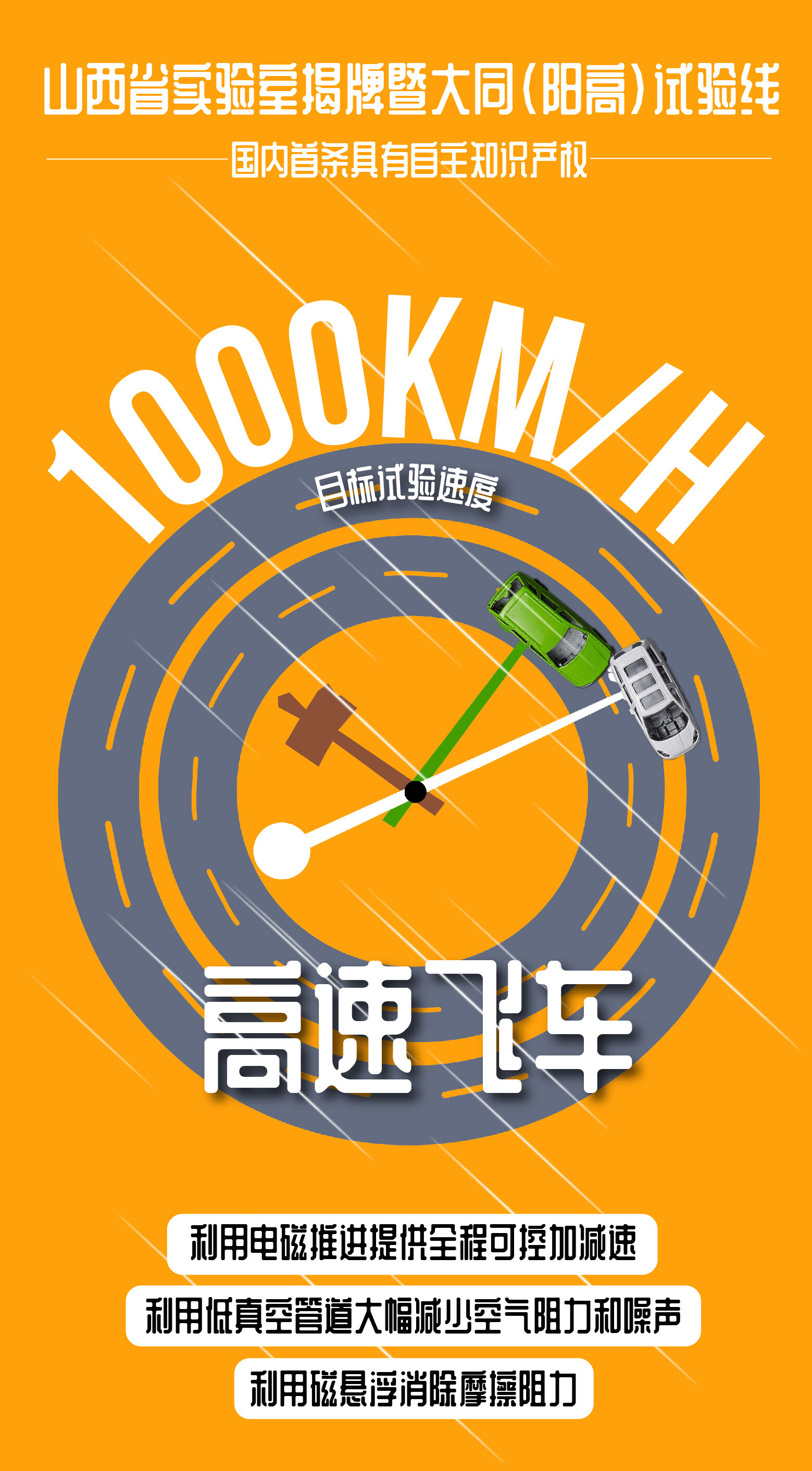 2021年5月24日上午,高速飞车山西省实验室揭牌暨大同(阳高)试验线工程开工奠基仪式在大同市举行。据介绍,这是国内首条具有自主知识产权、目标试验速度1000km/h的磁浮超高速交通试验线。