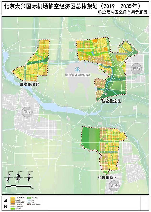 临空经济区总面积约150平方公里(其中北京部分约50平方公里、河北部分约100平方公里),包括服务保障区、航空物流区和科技创新区共3个功能片区。航空物流区重点承载航空物流、电子商务、综合保税、国际会展、航企服务等功能;科技创新区重点承载航空导向的研发创新、科技孵化、高端制造、科技金融等功能;服务保障区重点承载航空科教、特色金融、休闲娱乐、科技创新服务等功能。临空经济区坚持与雄安新区、首都机场临空经济区、中关村国家自主创新示范区、天津滨海新区等合理分工、互补错位、联动协同发展的原则,构建面向全球市场的临空指向性强、航空关联度高的高端高新产业集群,重点发展航空物流、航空科技创新、综合服务保障业,着力推动空港型综保区、跨境电商综合实验区、中国(河北)自由贸易试验区和自由贸易港建设,打造高水平开放基础平台。