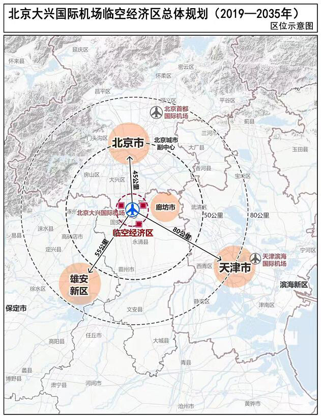 2019年10月25日,记者从北京市规划和自然资源委员会和河北省廊坊市政府了解到,北京市和河北省已于2019年9月5日正式批复了《北京大兴国际机场临空经济区总体规划(2019—2035年)》(以下简称《临空经济区总体规划》),标志着北京大兴国际机场临空经济区迈入了实质性建设阶段,为后续规划建设工作提供了基本依据,对疏解北京非首都功能、优化京津冀世界级城市群发展格局、促进区域全面协调可持续发展具有重要意义。