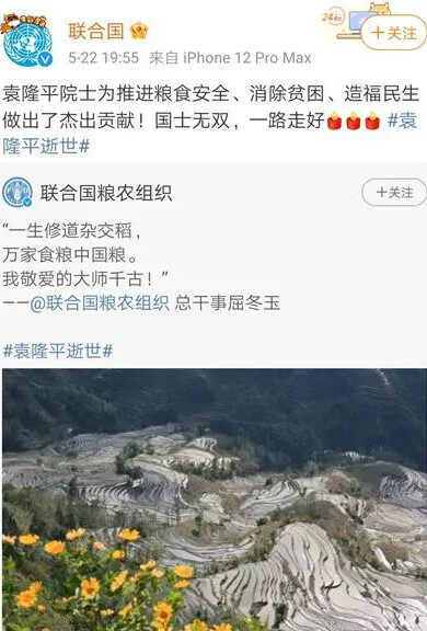 联合国、联合国粮农组织等也在其社交平台悼念袁隆平: