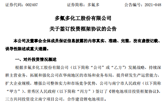 多氟多在《关于签订投资框架协议的公告》中称,根据公司发展战略,公司与南宁市人民政府、青秀区人民政府签订了《锂电池项目投资框架协议》,三方共同投资设立南宁项目公司,合作建设锂电池项目。