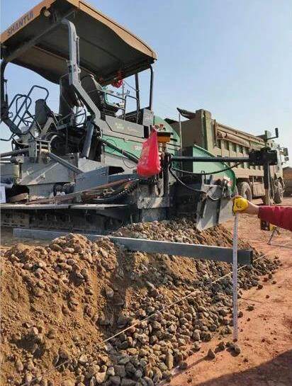 “快速路上有很多匝道和路口,井口更是多不胜数,做这个的摊铺机必须能伸缩,转弯处还能进行大厚度摊铺,最重要是摊铺速度要快。一车料45吨,一小时来8车料,所以摊铺机必须4分钟之内完成45吨水稳料的输料,分料,振捣,不然料车和拌和料场就要停工等待。”吴总买车前,聊起对新摊铺机的基本要求。