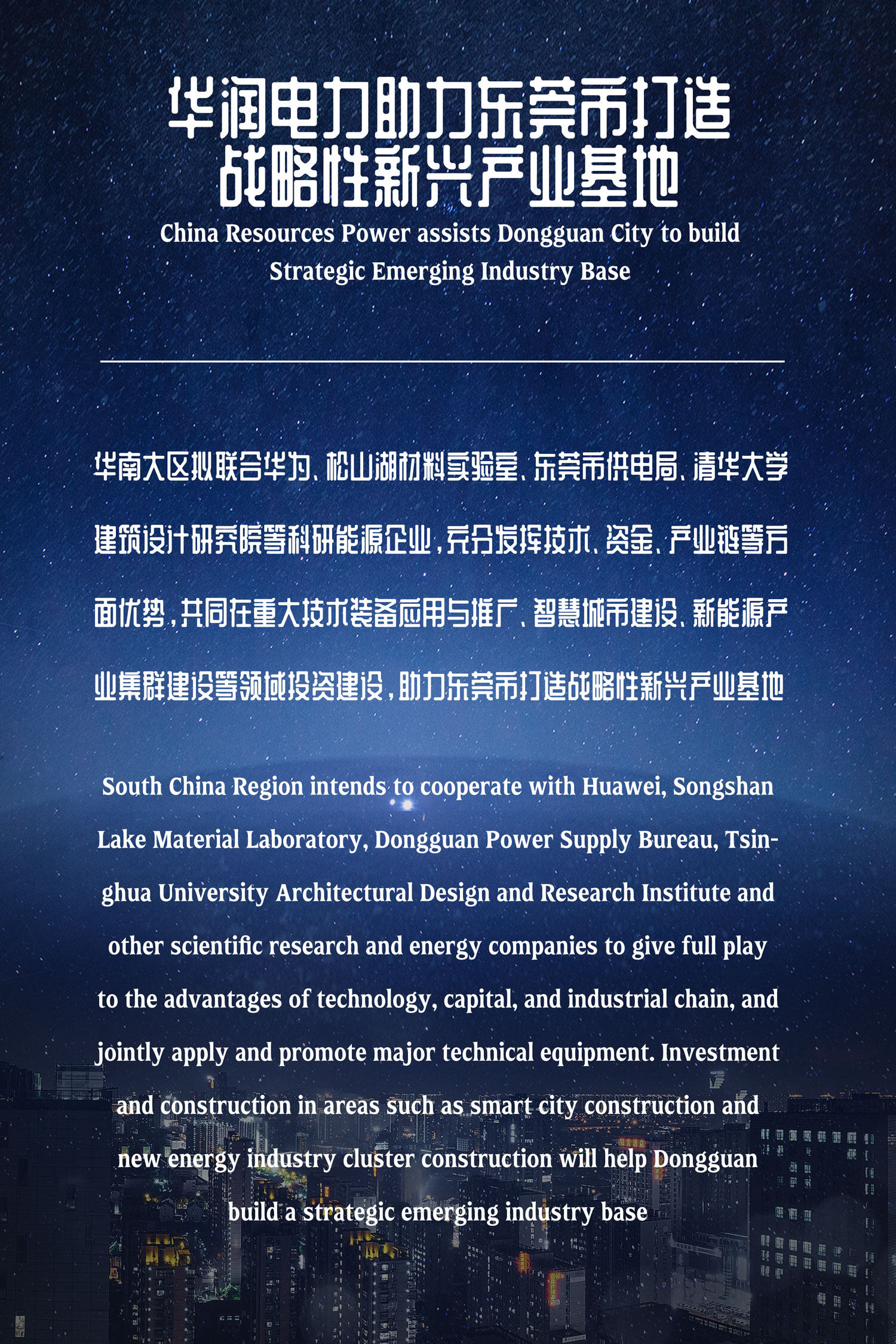为加快打造发展新动能,东莞布局战略性新兴产业基地。2021年5月21日,东莞市政府组织召开“2021东莞战略性新兴产业招商大会”,东莞市委书记梁维东、市长肖亚非出席会议,华润电力副总裁、华南大区总经理后永杰应邀参加。双方共同签署智慧能源产业战略合作协议。