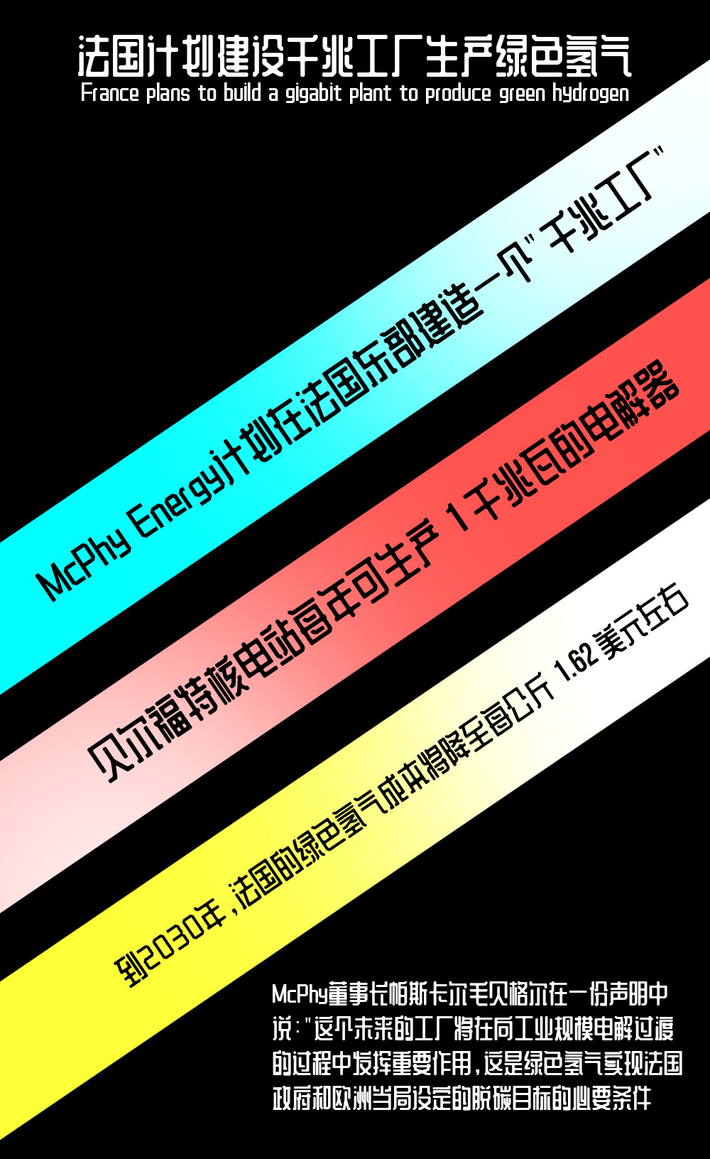 McPhy Energy计划在法国东部建造一个"千兆工厂",为氢气生产制造设备——这个行业处于欧洲削减碳排放计划的前沿。McPhy表示,贝尔福特核电站每年可生产1千兆瓦的电解器。这使得它与西门子能源和蒂森克虏伯等大型工业公司平起平坐,并将有助于推进法国大规模扩张可再生能源氢气的雄心壮志。McPhy董事长帕斯卡尔·毛贝格尔在一份声明中说:"这个未来的工厂将在向工业规模电解过渡的过程中发挥重要作用,这是绿色氢气实现法国政府和欧洲当局设定的脱碳目标的必要条件。
