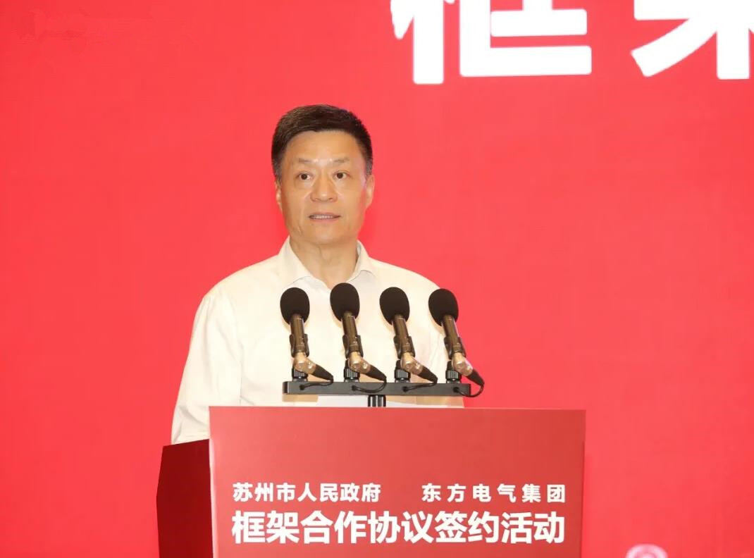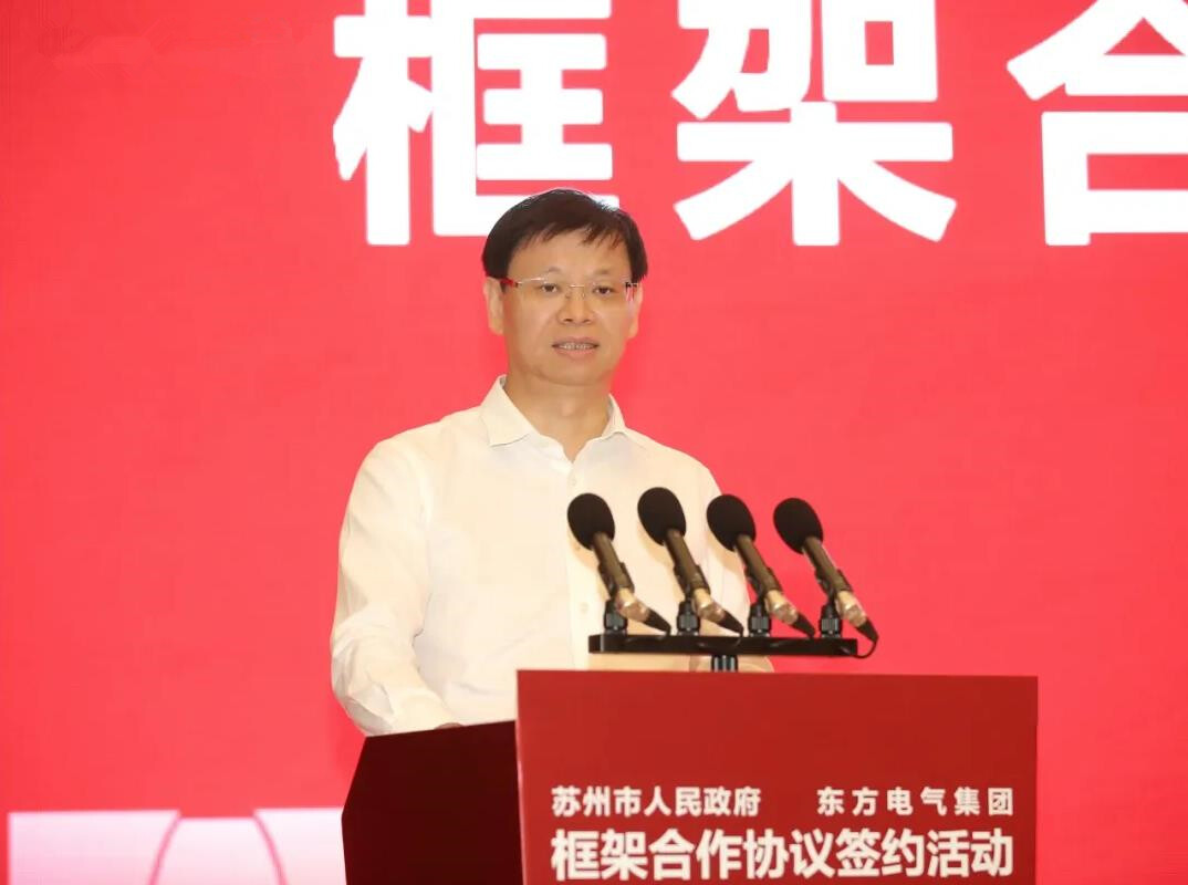 俞培根在致辞中感谢苏州对中国东方电气集团发展的大力支持,他说,中国东方电气集团作为能源装备制造行业的“国之重器”,始终坚守产业报国的初心,勇担制造强国的使命,服务能源低碳绿色转型。近年来,集团接连涌现一批重大创新成果,研制出众多新的高端装备,特别是在氢能产业方面,经过十多年的努力,已掌握了燃料电池关键核心技术,形成了提供氢获取、氢储存、氢加注、氢使用全环节整体解决方案的能力。苏州是长三角地区重要中心城市之一和国家高新技术产业基地,工业基础扎实,经济社会发展水平位居全国前列,发展势头迅猛。希望以此次签约为起点,携手合作、优势互补,以氢能产业为重点,面向装备和汽车制造、能源、环保等各领域开展全方位合作,共同开创创新发展新局面,深度服务党和国家实现碳达峰、碳中和的战略部署。