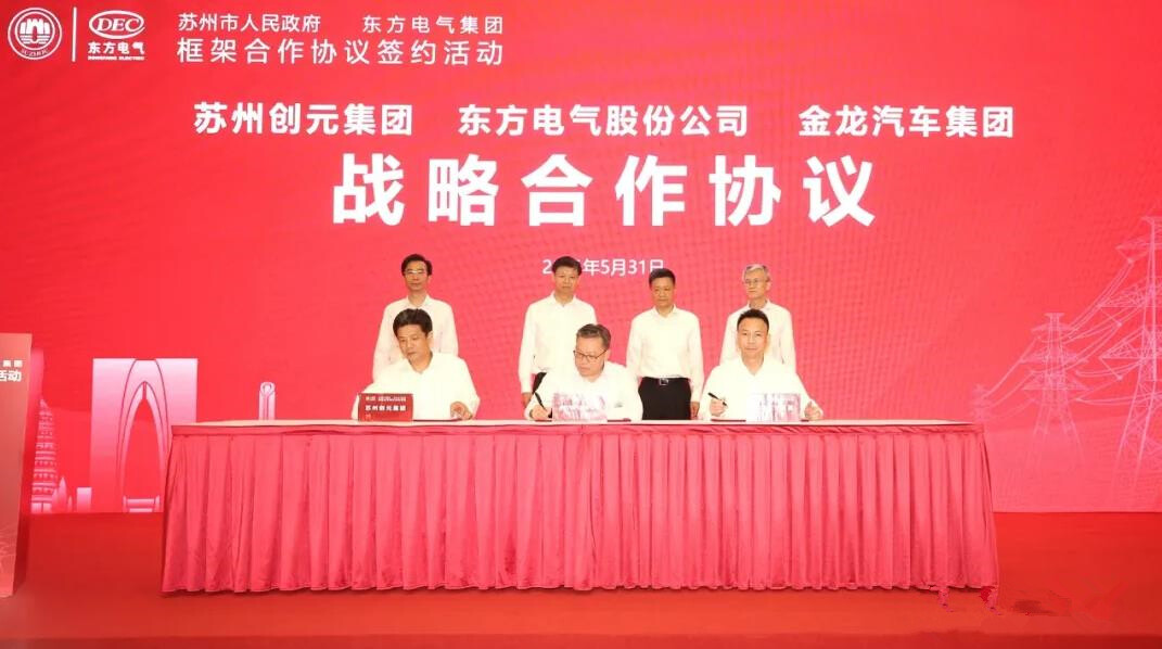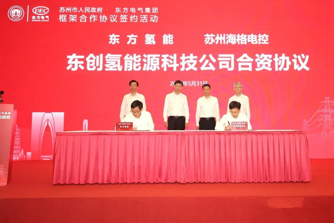 仪式上,东方氢能与苏州海格电控还签署了《江苏东创氢能源科技有限公司合资协议》,苏州创元集团、东方电气股份有限公司、金龙汽车集团签署了三方战略合作协议。