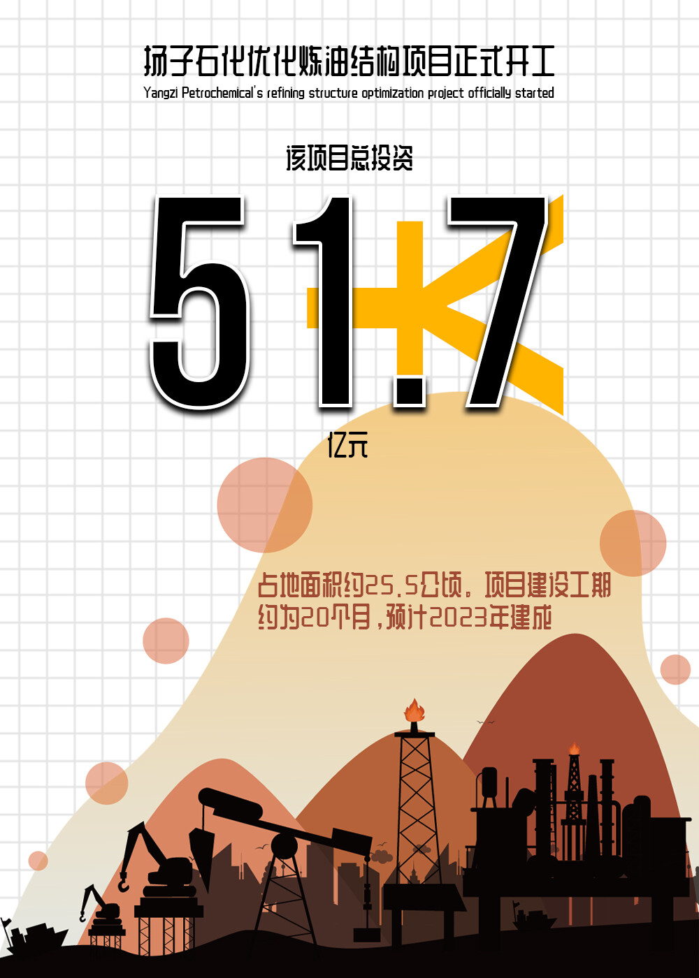 扬子石化炼油结构调整项目,是中国石化和南京市江北新区的重点工程项目,包括新建260万吨/年渣油加氢、280万吨/年催化裂化等8个重点项目,以转型升级、提质增效为目标,以增产化工原料为主要方向,最大化发挥炼化一体化优势。该项目总投资51.7亿元,占地面积约25.5公顷。项目建设工期约为20个月,预计2023年建成。