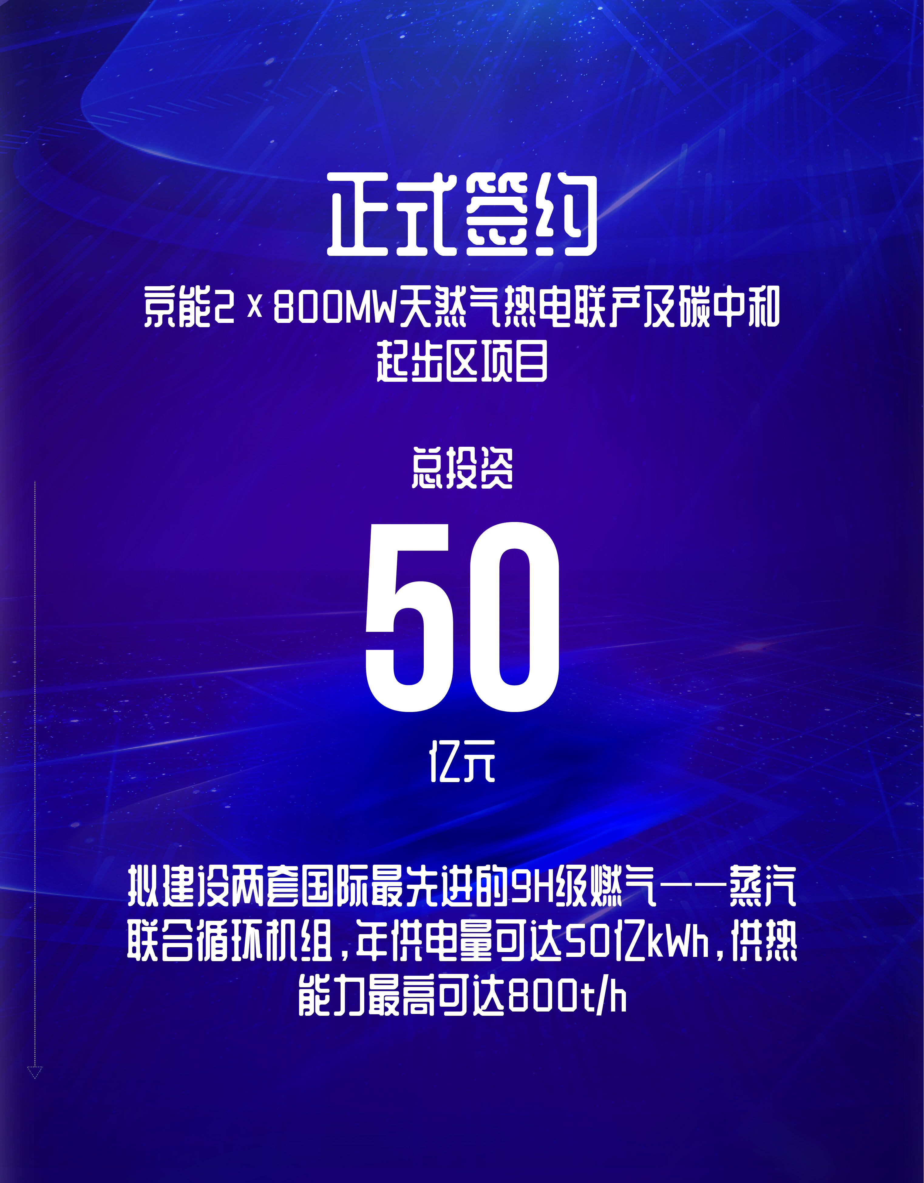 投资建设京能天然气热电联产及碳中和起步区项目规划建设2×800MW燃气供热发电机组,配套建设工业蒸汽管道和规划民用供热管道。拟建设两套国际最先进的9H级燃气——蒸汽联合循环机组,年供电量可达50亿kWh,供热能力最高可达800t/h。
