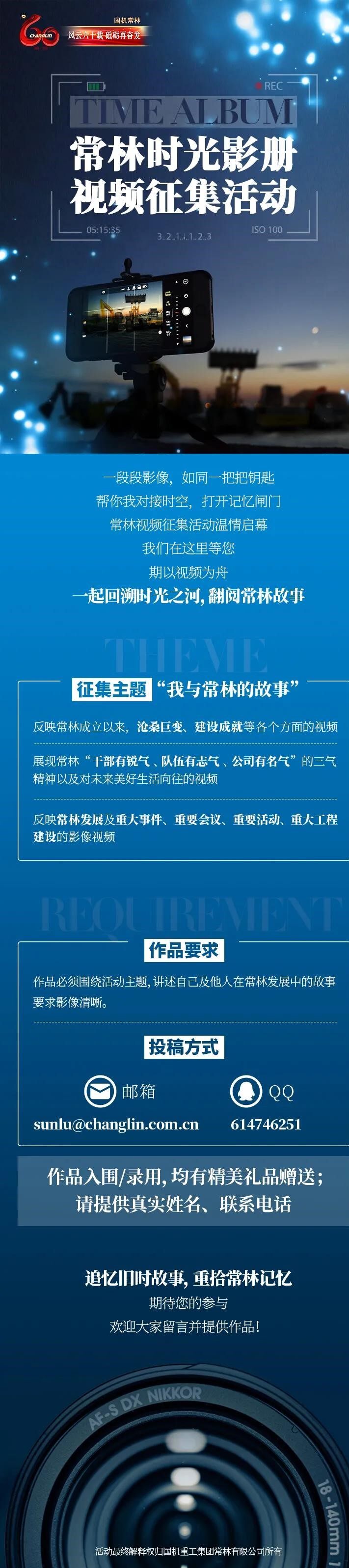 常林时光影册视频征集活动正式启动,有关常林建设变化、重大活动,反映常林职工队伍气概的视频影册均可参加,快来与常林共话美好记忆(转载请注明见道网www.seetao.com)见道网机械栏目编辑/鲍红英