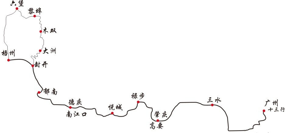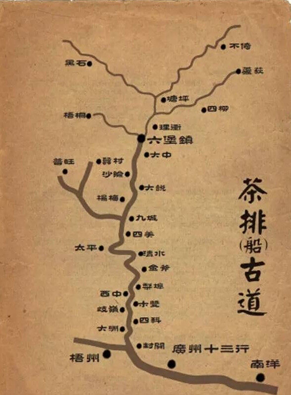 明清时期,随着茶叶贸易兴起,以贺江、西江航道为纽带的茶船古道逐渐繁华。广西茶商在六堡镇收购茶叶后,在封开转大船到广州,再下南洋。同时,六堡茶还通过潇贺古道、灵渠北上,上贡朝廷。