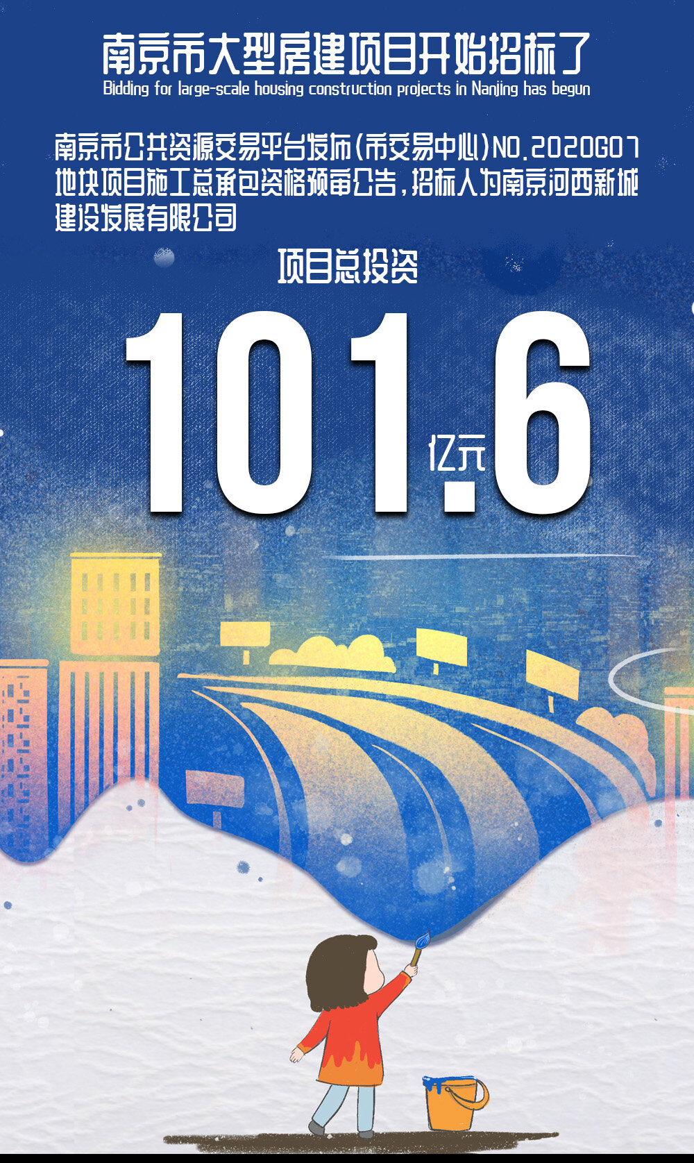 On June 3, 2021, Nanjing Public Resources Trading Platform issued (City Trading Center) NO.2020G07 land parcel project construction general contract pre-qualification announcement. The bidder was Nanjing Hexi New City Construction Development Co., Ltd., with a total project investment of 10.16 billion yuan.