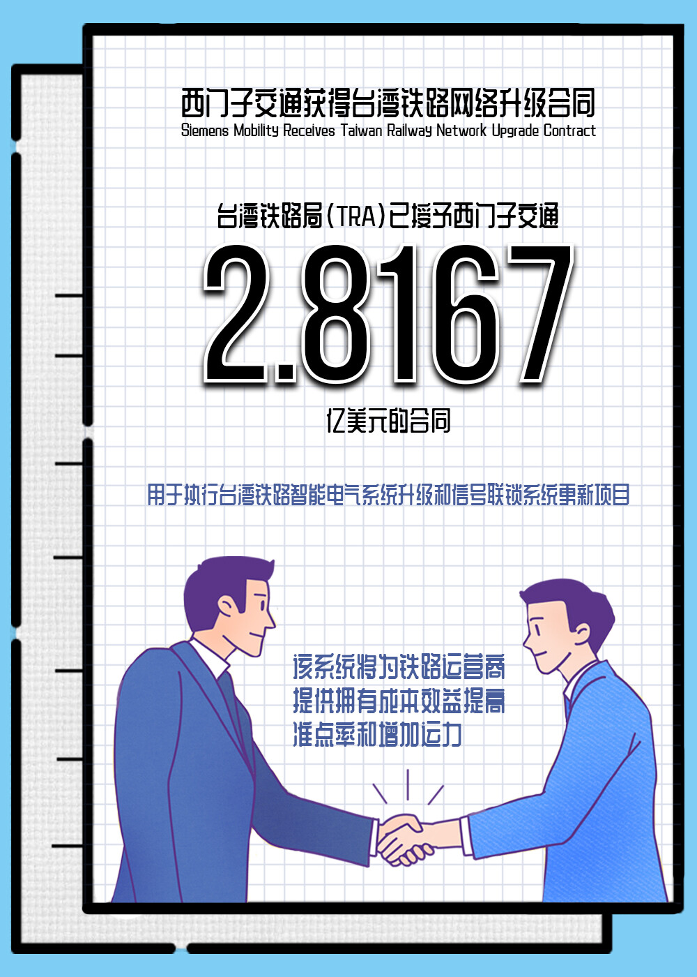 台湾铁路局(TRA)已授予西门子交通2.8167亿美元(2.31 亿欧元)的合同,用于执行台湾铁路智能电气系统升级和信号联锁系统更新项目。作为该项目的一部分,现有的继电器联锁系统将被覆盖铁路网450公里的68个车站的新电子联锁(EI) 系统所取代。